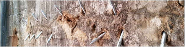 Нагнетание составов в конструкцию осуществляется через инъекционные пакеры, установленные в заранее пробуренные отверстия. После окончания ремонта пакеры удаляются и отверстия запечатываются ремонтными составами.
