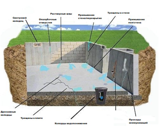 Наиболее распространённой проблемой являются водопроявления через трещины, швы и вводы коммуникаций.