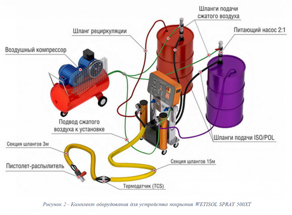 Основное защитное покрытие WETISOL SPRAY 500XT наносят методом горячего спрей распыления при помощи специального оборудования (дозатор высокого давления с раздельной подачей и подогревом компонентов).