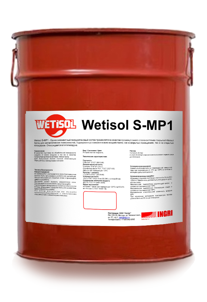 Однокомпонентный полиуретановый состав применяется в качестве промежуточного слоя в системах покрытий Wetisol Spray для металлических, бетонных и железобетонных оснований и поверхностей, подверженных климатическим воздействиям, как в закрытых помещениях, так и на открытых площадках. Отверждается влагой воздуха.