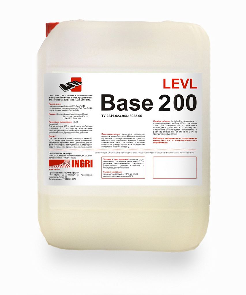 Цемент және полимерцемент жабындарын қолданар алдында бетон негізін дайындауға арналған праймер құрамы. Levl BASE 200.